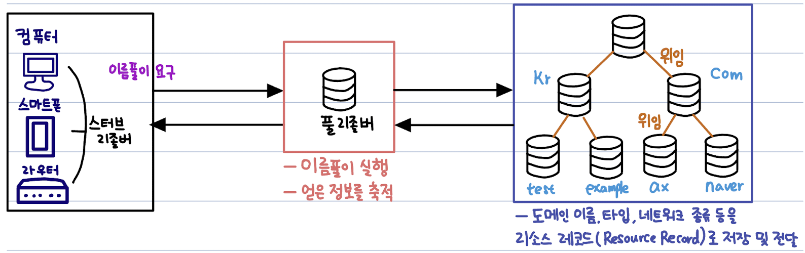 '스터브 리졸버'는 정보가 필요한 사람, '풀 리졸버'는 의뢰를 받아 이름풀이를 진행하는 사람, '권한있는 서버'는 자기가 알고있는 정보를 관리하고 요청을 수락 or 거부하는 사람